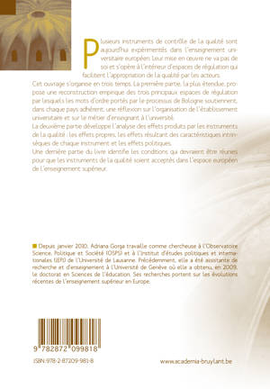 Cette étude devrait permettre aux décideurs et aux responsables politiques et institutionnels, aux enseignants, aux chercheurs, et plus généralement à tous ceux qui s'intéressent aux changements complexes initiés par le processus européen de Bologne, de mieux comprendre les enjeux et les attentes liés aux transformations actuelles. Il s'agit d'un examen comparatif de l'assurance qualité et de l'accréditation, de la culture de la qualité et du débat en termes de qualité sur l'enseignement donné à l'université en Suisse et en Roumanie.