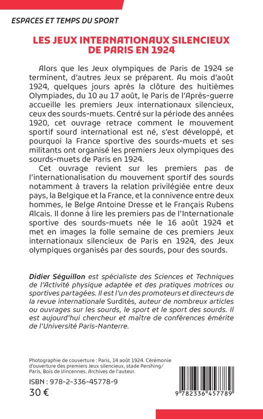 Alors que les Jeux olympiques de Paris de 1924 se terminent, d'autres Jeux se préparent. Au mois d'août 1924, quelques jours après la clôture des huitièmes Olympiades, du 10 au 17 août, le Paris de l'Après-guerre accueille les premiers Jeux internationaux silencieux, ceux des sourds-muets. Centré sur la période des années 1920, cet ouvrage retrace comment le mouvement sportif sourd international est né, s'est développé, et pourquoi la France sportive des sourds-muets et ses militants ont organisé les premiers Jeux olympiques des sourds-muets de Paris en 1924. Cet ouvrage revient sur les premiers pas de l'internationalisation du mouvement sportif des sourds notamment à travers la relation privilégiée entre deux pays, la Belgique et la France, et la connivence entre deux hommes, le Belge Antoine Dresse et le Français Rubens Alcais. Il donne à lire les premiers pas de l'Internationale sportive des sourds-muets née le 16 août 1924 et met en images la folle semaine de ces premiers Jeux internationaux silencieux de Paris en 1924, des Jeux olympiques organisés par des sourds, pour des sourds.