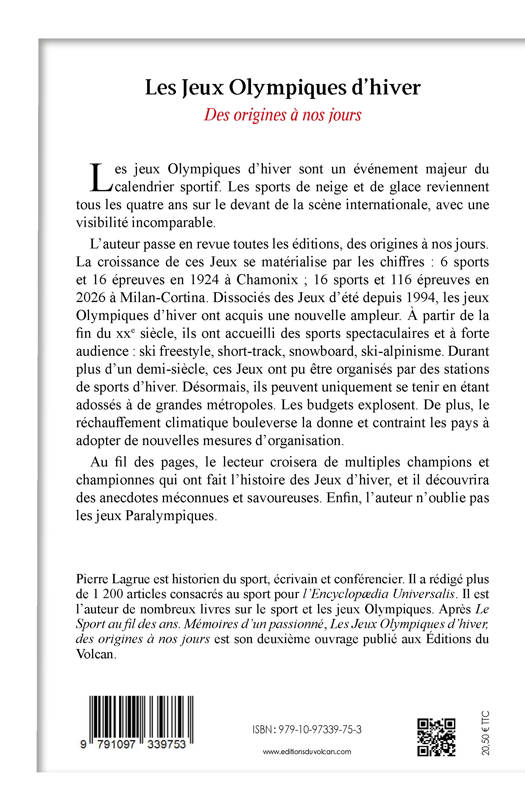 Revivez l’histoire des jeux Olympiques d’hiver, des origines à nos jours. Toutes les éditions, tous les exploits. Nés il y a un siècle dans la discrétion, les jeux Olympiques d’hiver sont devenus un événement majeur du calendrier sportif. Ils réunissaient, à Chamonix en 1924, 6 sports et 16 épreuves , ils proposent, en 2026, à Milan-Cortina, 16 sports et 116 épreuves. Les Jeux d’hiver, après avoir grandi peu à peu, ont pris une nouvelle ampleur au tournant des années 1990, quand le Comité international olympique a décidé d’organiser des Jeux d’hiver en 1992 puis en 1994 : l’objectif était de dissocier Jeux d’hiver et Jeux d’été, afin de voir les jeux Olympiques revenir sur le devant de la scène médiatique tous les deux ans, ce qui est bon pour le marketing et les affaires. En outre, à partir de la fin du xxe siècle, pour plaire aux sponsors et à la jeunesse, les Jeux d’hiver ont accueilli des sports spectaculaires et à forte audience médiatique : ski freestyle, short-track, snowboard, ski-alpinisme. Durant plus d’un demi-siècle, ces Jeux ont pu être organisés par des stations de sports d’hiver ou des villes moyennes. Désormais, en raison de leur envergure nouvelle, ils peuvent uniquement se tenir en étant adossés à de grandes métropoles (Vancouver, 2010 , Pékin, 2022 , Milan, 2026). Les budgets explosent : sans même revenir sur la démesure de Sotchi en 2014 (un investissement de 37 milliards d’euros), les Jeux d’hiver coûtent cher – 10,5 milliards d’euros pour les Jeux de PyeongChang (2018) , 3,5 milliards d’euros pour les Jeux de Pékin (2022) , 2,6 milliards d’euros pour les Jeux de Milan-Cortina (2026). De plus, le réchauffement climatique bouleverse la donne : à l’horizon de 2050, vingt sites qui ont déjà accueilli les Jeux d’hiver ne pourraient plus le faire pour cette raison , l’utilisation de la neige artificielle devient la norme. Malgré tous ces tourments, on gardera en mémoire les exploits de champions et de championnes charismatiques. En France, on se souvient des triomphes de Jean-Claude Killy ou des soeurs Goitschel dans les années 1960, des victoires du biathlète Martin Fourcade dans les années 2010. Comment oublier les prestations des patineuses Sonja Henie et Katarina Witt ? En Norvège, les vedettes sont issues des disciplines nordiques : Ole Einar Bjørndalen, Marit Bjørgen, Bjørn Dæhlie. Désormais, les stars viennent surtout des sports funs : snowboard (Shaun White, Lindsey Jacobellis, Pierre Vaultier...), ski freestyle (David Wise, Gu Ailing, Perrine Laffont...). L’auteur passe en revue toutes les éditions, depuis l’élection de la ville d’accueil jusqu’aux exploits sportifs. Il propose aussi des anecdotes méconnues et savoureuses. Il n’oublie pas les jeux Paralympiques. Points forts: Le récit d’un historien du sport Tous les jeux Olympiques d’hiver de 1924 à nos jours Toutes les disciplines des JO d’hiver Une analyse complète Les aspects extra-sportifs, les coulisses, les anecdotes Les champions et les championnes Les jeux Paralympiques À propos de l'auteur: Pierre Lagrue est historien du sport, écrivain et conférencier. Il a rédigé plus de 1 200 articles consacrés au sport pour l’Encyclopædia Universalis. Il est l’auteur de nombreux livres sur le sport et les jeux Olympiques. Après Le Sport au fil des ans. Mémoires d’un passionné, Les Jeux Olympiques d’hiver, des origines à nos jours est son deuxième ouvrage publié aux Éditions du Volcan.