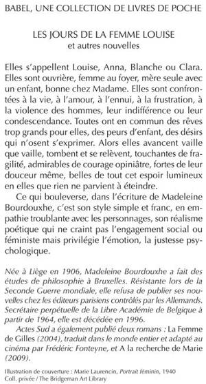 « Née à Liège en 1906, Madeleine Bourdouxhe a fait des études de philosophie à Bruxelles. Résistante lors de la Seconde Guerre mondiale, elle refusa de publier ses nouvelles chez les éditeurs parisiens contrôlés par les Allemands. Secrétaire perpétuelle de la Libre Académie de Belgique à partir de 1964, elle est décédée en 1996. Actes Sud a également publié deux romans :» La Femme de Gilles« (2004), traduit dans le monde entier et adapté au cinéma par Frédéric Fonteyne, et »A la recherche de Marie« (2009).»