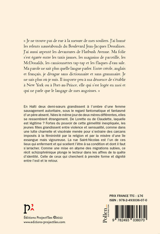 En Haïti deux demi-soeurs grandissent à l’ombre d’une femme sauvagement autoritaire, sous le regard fantomatique et fantasmé d’un père absent. Nées le même jour de deux mères différentes, elles se ressemblent étrangement. De Lorette ou de Claudette, laquelle est légitime ? Fortes du pouvoir de cette gémellité inexpliquée, les jeunes filles grandissent entre violence et sensualité, comme dans une lutte charnelle et viscérale menée pour s’extraire des carcans imposés à la fémininité par la religion et par la misère d’une île exsangue mais vigoureuse. La rue Saint-Nicolas est l’un de ces lieux qui enferment et qui scellent l’être à sa condition et dont il faut s’arracher, quitte à y laisser quelques lambeaux de peau et d’être. Comme une mise en abyme des migrations subies, ce récit schizophrénique plonge le lecteur dans les affres de la quête d’identité. Celle de ceux qui cherchent à prendre forme et dignité entre l’exil et le retour.