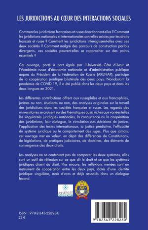 Comment les juridictions françaises et russes fonctionnent-elles ? Comment les juridictions nationales et internationales sont-elles saisies par les droits français et russe ? Comment les juridictions interagissent-elles avec ces deux sociétés ? Comment malgré des parcours de construction parfois divergents, ces sociétés peuvent-elles se rapprocher sur des points essentiels ? Cet ouvrage participe de la coopération juridique bilatérale de la France et de la Russie.