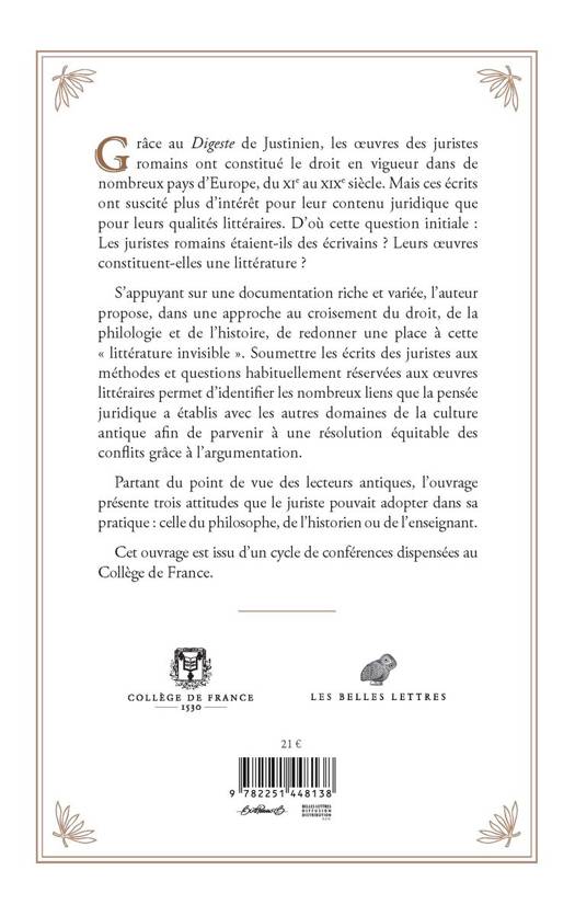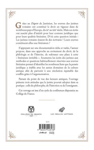 Grace au Digeste de Justinien, les oeuvres des juristes romains ont constitue le droit en vigueur dans de nombreux pays d'Europe, du XIe au XIXe siecle. Mais ces ecrits ont suscite plus d'interet pour leur contenu juridique que pour leurs qualites litteraires. D'ou cette question initiale: Les juristes romains etaient-ils des ecrivains ? Leurs oeuvres constituent-elles une litterature ? S'appuyant sur une documentation riche et variee, l'auteur propose, dans une approche au croisement du droit, de la philologie et de l'histoire, de redonner une place a cette litterature invisible . Soumettre les ecrits des juristes aux methodes et questions habituellement reservees aux oeuvres litteraires permet d'identifier les nombreux liens que la pensee juridique a etablis avec les autres domaines de la culture antique afin de parvenir a une resolution equitable des conflits grace a l'argumentation. Partant du point de vue des lecteurs antiques, l'ouvrage presente trois attitudes que le juriste pouvait adopter dans sa pratique: celle du philosophe, de l'historien ou de l'enseignant. Cet ouvrage est issu d'un cycle de conferences dispensees au College de France.