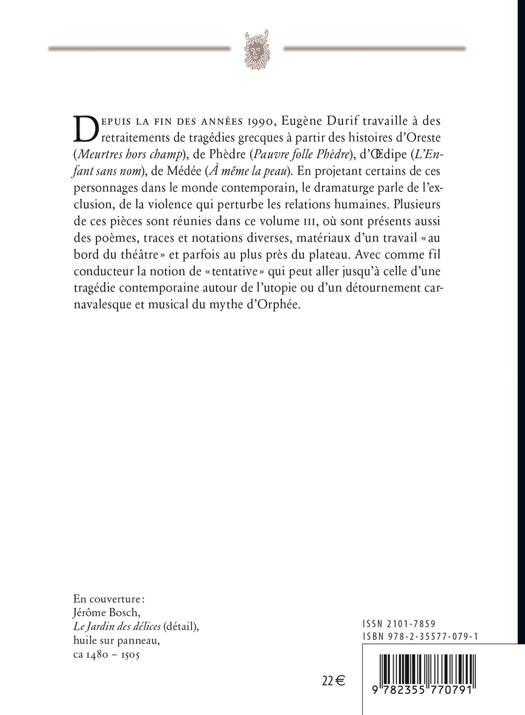 Depuis la fin des années 1990, Eugène Durif travaille à des retraitements de tragédies grecques à partir des histoires d’Oreste (Meurtres hors champ), de Phèdre (Pauvre folle Phèdre), d’Œdipe (L’Enfant sans nom), de Médée (À même la peau). En projetant certains de ces personnages dans le monde contemporain, le dramaturge parle de l’exclusion, de la violence qui perturbe les relations humaines. Plusieurs de ces pièces sont réunies dans ce Tome III, où sont présents aussi des poèmes, traces et notations diverses, matériaux d’un travail « au bord du théâtre » et parfois au plus près du plateau. Avec comme fil conducteur la notion de « tentative » qui peut aller jusqu’à celle d’une tragédie contemporaine autour de l’utopie ou d’un détournement carnavalesque et musical du mythe d’Orphée. Le Tome 3 de Au Bord du Théâtre de Eugène Durif réunit les textes suivants : • - La voix cassée de la tragédie • - Rêves d'Electre. Fragments de travail • - A la vie, à l'amour, à la mort (de la vie) • - Pauvre folle Phèdre • - Comme enfant on joue à mourir. Variations Antigone • - Médée à même la peau • - La fin du monde en avançant • - Orphée en coulisses