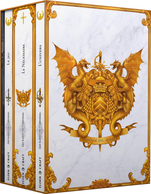 Avec ce coffret, vous avez donc tous les éléments nécessaires pour jouer aux Lames du Cardinal : - L’Univers : ce livre décrit l’univers des Lames du Cardinal. Dragons, monde des Lames, différentes nations, éléments particuliers de l’uchronie, France et Paris… - Le Jeu : ce livre contient les éléments mécaniques du jeu de rôle des Lames du Cardinal. Création de personnage, système de jeu, mécaniques, conseils et deux scénarios… - Le Nécessaire : un coffret qui contient toutes les aides de jeux qui donneront du relief à vos parties : tarot des Ombres, cartes de profils, tableau de contacts, deck de combat, aides de jeu sur l’escrime, jetons de ressources, fiches de personnages… - L’écran de jeu et ses précieux aide-mémoire