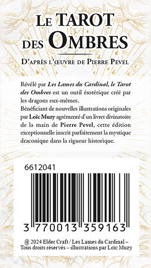 Révélé par Les Lames du Cardinal, le Tarot des Ombres est un outil ésotérique créé par les dragons eux-mêmes. Bénéficiant de nouvelles illustrations originales par Loïc Muzy agrémenté d’un livret divinatoire de la main de Pierre Pevel, cette édition exceptionnelle inscrit parfaitement la mystique draconique dans la rigueur historique.
