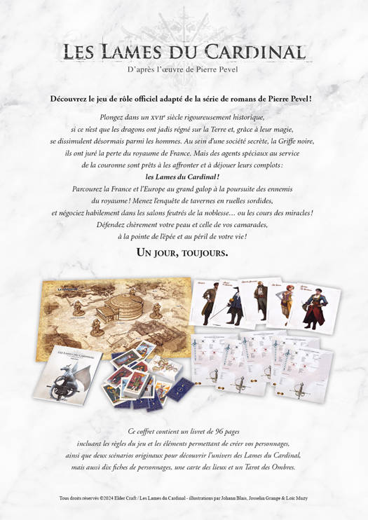 Ce coffret contient un livret de 96 pages, incluant les règles du jeu et les éléments permettant de créer vos personnages, ainsi que deux scénarios originaux pour découvrir l’univers des Lames du Cardinal, mais aussi dix fiches de personnages, une carte des lieux et un Tarot des Ombres.