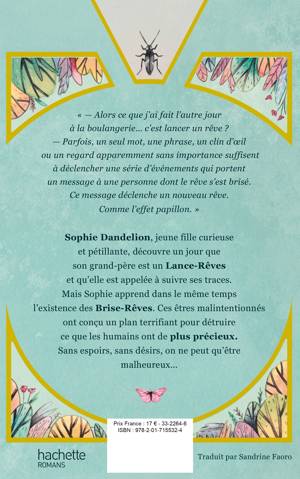 « — Alors ce que j’ai fait l’autre jour à la boulangerie… c’est lancer un rêve ? — Parfois, un seul mot, une phrase, un clin d’œil ou un regard apparemment sans importance suffisent à déclencher une série d’événements qui portent un message à une personne dont le rêve s’est brisé. Ce message fait naître un nouveau rêve. Comme l’effet papillon. » Sophie Dandelion, jeune fille curieuse et pétillante, découvre un jour que son grand-père est un Lance-Rêves et qu’elle est appelée à suivre ses traces. Mais Sophie apprend dans le même temps l’existence des Brise-Rêves. Ces êtres malintentionnés ont conçu un plan terrifiant pour détruire ce que les humains ont de plus précieux. Sans espoirs, sans désirs, on ne peut qu’être malheureux…
