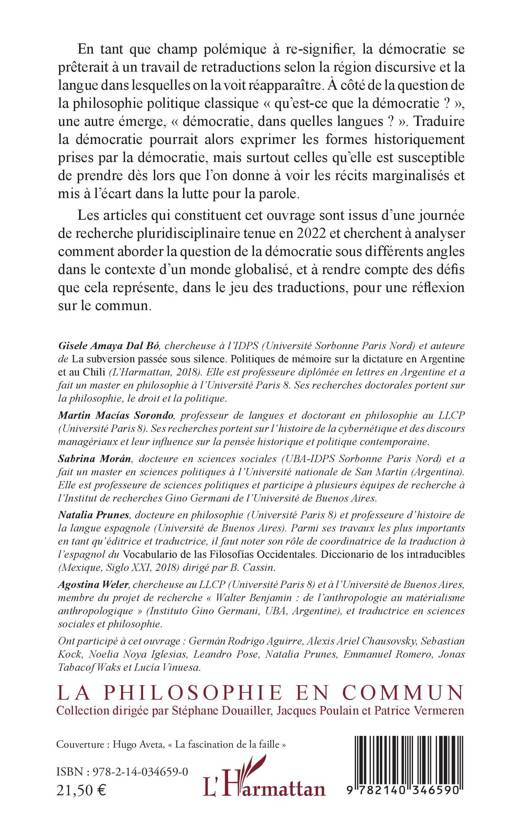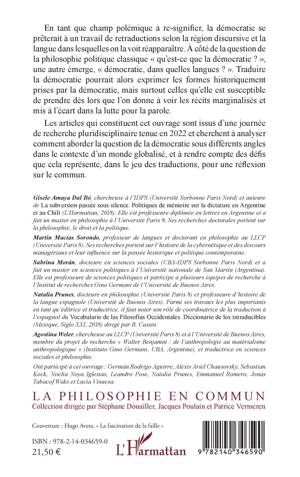 En tant que champ polémique à re-signifier, la démocratie se prêterait à un travail de retraductions selon la région discursive et la langue dans lesquelles on la voit réapparaître. À côté de la question de la philosophie politique classique « qu'est-ce que la démocratie ? », une autre émerge, « démocratie, dans quelles langues ? ». Traduire la démocratie pourrait alors exprimer les formes historiquement prises par la démocratie, mais surtout celles qu'elle est susceptible de prendre dès lors que l'on donne à voir les récits marginalisés et mis à l'écart dans la lutte pour la parole. Les articles qui constituent cet ouvrage sont issus d'une journée de recherche pluridisciplinaire tenue en 2022 et cherchent à analyser comment aborder la question de la démocratie sous différents angles dans le contexte d'un monde globalisé, et à rendre compte des défis que cela représente, dans le jeu des traductions, pour une réflexion sur le commun.