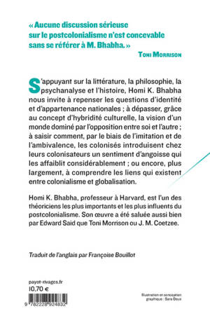 Salué aussi bien par Edward Said que par Toni Morrison ou J. M. Coetzee, Homi K. Bhabha est l'un des théoriciens les plus importants et les plus influents du postcolonialisme. S'appuyant sur la littérature, la philosophie, la psychanalyse et l'histoire, il invite notamment à repenser les questions très actuelles d'identité et d'appartenance nationales ; à dépasser, grâce au concept très fécond d'hybridité culturelle, la vision d'un monde dominé par l'opposition entre soi et l'autre ; à saisir comment, par le biais de l'imitation et de l'ambivalence, les colonisés introduisent chez leurs colonisateurs un sentiment d'angoisse qui les affaiblit considérablement ; ou encore, plus largement, à comprendre les liens qui existent entre colonialisme et globalisation. « Aucune discussion sérieuse su