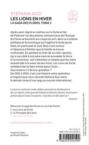 Après avoir régné en maîtres sur la Sicile et fait de Palerme l’un des phares commerciaux de l’Europe, les Florio se heurtent aux coups du sort, dans un contexte politique et économique qui fragilise la toute jeune Italie, en particulier le Sud. Mais c’est surtout à l’absence d’un héritier que la famille se trouve confrontée. En perdant la chair de sa chair, Ignazio, qui a succédé à son père sans en posséder la force ni la conviction, voit s’éteindre un empire que les siens avaient bâti à la sueur de leur front. Les Lions de Sicile semblent bel et bien entrés dans l’hiver… Que restera-t-il de leur grandeur ? De 1901 à 1950, c’est une histoire entre splendeur et regrets que nous raconte Stefania Auci dans le dernier tome d’une saga au succès international.