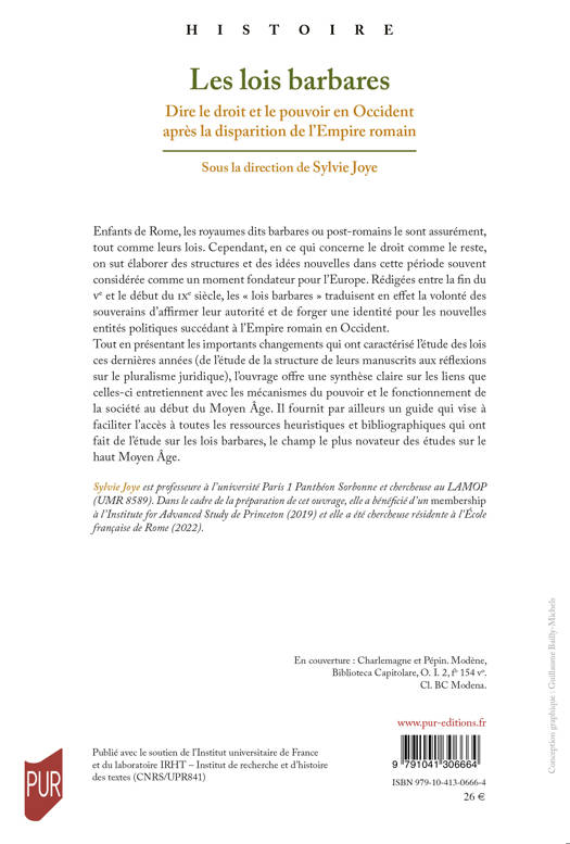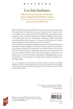 Enfants de Rome, les royaumes dits barbares ou post-romains le sont assurément, tout comme leurs lois. Cependant, en ce qui concerne le droit comme le reste, on sut élaborer des structures et des idées nouvelles dans cette période souvent considérée comme un moment fondateur pour l’Europe. Rédigées entre la fin du Ve et le début du IXe siècle, les « lois barbares » traduisent en effet la volonté des souverains d’affirmer leur autorité et de forger une identité pour les nouvelles entités politiques succédant à l’Empire romain en Occident. Tout en présentant les importants changements qui ont caractérisé l’étude des lois ces dernières années (de l’étude de la structure de leurs manuscrits aux réflexions sur le pluralisme juridique), l’ouvrage offre une synthèse claire sur les liens que celles-ci entretiennent avec les mécanismes du pouvoir et le fonctionnement de la société au début du Moyen Âge. Il fournit par ailleurs un guide qui vise à faciliter l’accès à toutes les ressources heuristiques et bibliographiques qui ont fait de l’étude sur les lois barbares, le champ le plus novateur des études sur le haut Moyen Âge.
