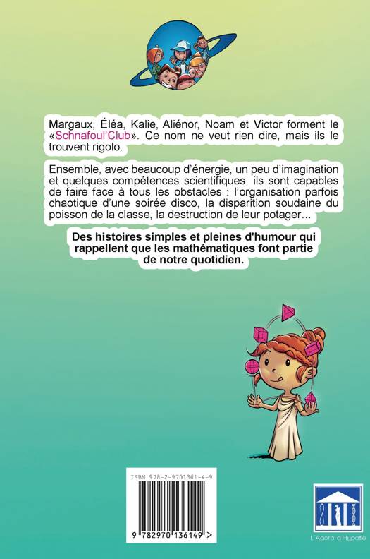 Margaux, Élea, Kalie, Aliénor Noam et Victor forment le « Schnafoul’Club ». Ce nom ne veut rien dire, mais ils le trouvent rigolo. Ensemble, avec beaucoup d’énergie, un peu d’imagination et quelques compétences scientifiques, ils sont capables de faire face à tous les obstacles : l’organisation parfois chaotique d’une soirée disco, la disparition soudaine du poisson de la classe, la destruction de leur potager… Des histoires simples et pleines d'humour qui rappellent que les mathématiques font partie de notre quotidien.