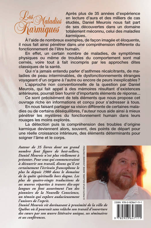 Après plus de 25 années d'expérience en lecture d'aura et des milliers de cas étudiés, Daniel Meurois nous fait part, pour la première fois aujourd'hui, de ses découvertes dans un domaine totalement méconnu, celui des maladies karmiques. À l'aide de nombreux exemples, de façon imagée et éloquente, il nous fait ainsi pénétrer dans une compréhension différente du fonctionnement de l'être humain. Un certain nombre de maladies, de symptômes physiques ou même de troubles du comportement sont mal cernés, voire tout à fait incompris par les approches dites classiques de la santé. Qui n'a jamais entendu parler d'asthmes récalcitrants, de maladies de peau interminables, de dysfonctionnements étranges voyageant d'un organe à l'autre ou encore de peurs inexplicables ? En nous faisant partager sa vision différente de certaines maladies ou de certains déséquilibres, l'auteur nous aide ainsi à mieux pénétrer les mystères du fonctionnement humain dans leurs rouages les moins explorés. La détection puis la compréhension des troubles d'origine karmique deviennent alors, souvent, des points de départ pour une réelle croissance intérieure, des éléments déterminants pour soigner l'âme et le corps. Voici une approche non conventionnelle, faisant appel à des mémoires résultant d'existences antérieures, pour enfin fournir des réponses...