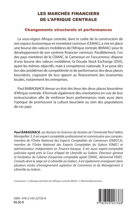 La sous-région Afrique centrale, dans le cadre de la construction de son espace économique et monétaire commun (CEMAC), a mis en place une bourse des valeurs mobilières de l'Afrique centrale pour le développement de son système financier commun. Parallèlement, l'un des pays membres de la CEMAC, le Cameroun, dispose d'une bourse des valeurs mobilières, ayant les mêmes objectifs, mais à compétence nationale. Paul BABAGNACK dresse un état des lieux des deux places boursières d'Afrique centrale. Il formule également des orientations en vue de leur restructuration afin de renforcer leurs performances mais aussi dans l'optique de promouvoir la culture boursière au sein des populations de ces pays.