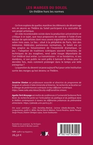 Ce livre explore de quelles manières les éléments de décentrage mis en oeuvre au Théâtre du Soleil participent à la centralité de son projet artistique. Un vide incontestable existe dans la production universitaire et critique à ce sujet, que nous proposons de combler à l'aide d'une équipe de spécialistes dont nous avons organisé les contributions selon trois axes. Le lieu: situé à la périphérie de Paris, loin des mémoires théâtrales parisiennes normatives, le Soleil est un lieu propice au foisonnement de l'inventivité dramatique. Le jeu: l'adoption de traditions scéniques souvent lointaines, de techniques de jeu exogènes, rend cette troupe dépositaire de l'art théâtral tout entier. La transmission: ni sa fondatrice, ni ses membres, ni son public ne sont prêts à baisser le rideau pour la dernière fois, mais comment prolonger dans le temps une telle entreprise ? La question du devenir se pose aujourd'hui pour cette institution sortie des marges qu'est devenu ce Théâtre.