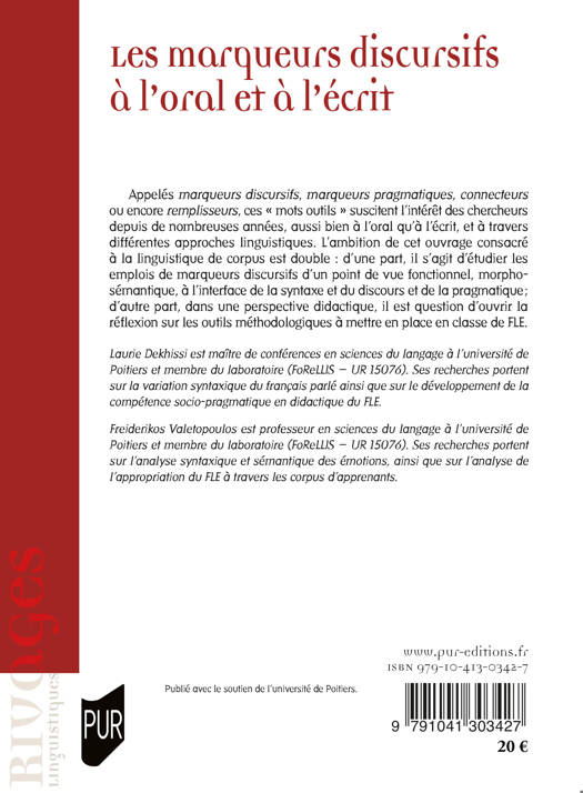 Appelés marqueurs discursifs, marqueurs pragmatiques, connecteurs ou encore remplisseurs, ces « mots outils » suscitent l’intérêt des chercheurs depuis de nombreuses années, aussi bien à l’oral qu’à l’écrit, et à travers différentes approches linguistiques. L’ambition de cet ouvrage consacré à la linguistique de corpus est double : d’une part, il s’agit d’étudier les emplois de marqueurs discursifs d’un point de vue fonctionnel, morphosémantique, à l’interface de la syntaxe et du discours et de la pragmatique ; d’autre part, dans une perspective didactique, il est question d’ouvrir la réflexion sur les outils méthodologiques à mettre en place en classe de FLE.
