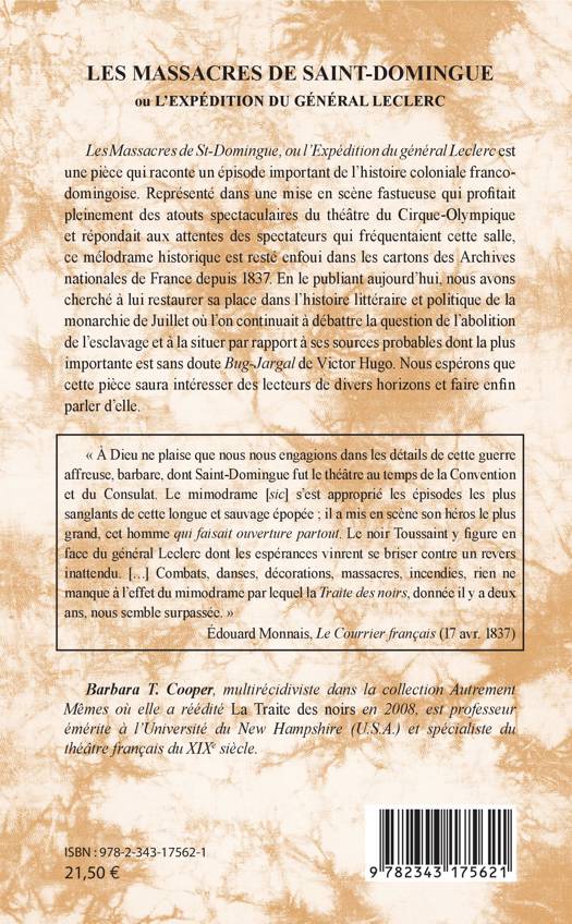 "Les Massacres de St-Domingue, ou l'Expédition du général Leclerc" est une pièce qui raconte un épisode important de l'histoire coloniale franco-domingoise. Représenté dans une mise en scène fastueuse qui profitait pleinement des atouts spectaculaires du théâtre du Cirque-Olympique, ce mélodrame historique est resté enfoui dans les cartons des Archives nationales de France depuis 1837. En le publiant aujourd'hui, nous avons cherché à lui restaurer sa place dans l'histoire littéraire et politique de la monarchie de Juillet.