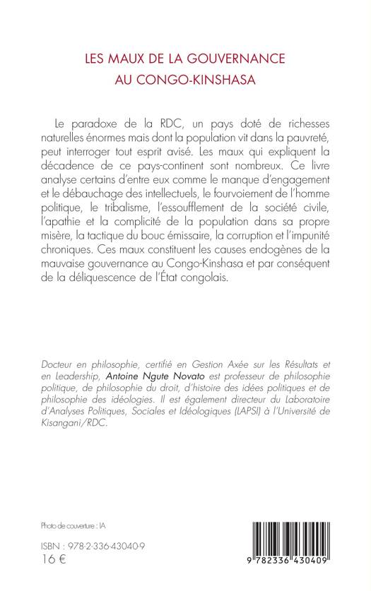 Le paradoxe de la RDC, un pays doté de richesses naturelles énormes mais dont la population vit dans la pauvreté, peut interroger tout esprit avisé. Les maux qui expliquent la décadence de ce pays-continent sont nombreux. Ce livre analyse certains d’entre eux comme le manque d’engagement et le débauchage des intellectuels, le fourvoiement de l’homme politique, le tribalisme, l’essoufflement de la société civile, l’apathie et la complicité de la population dans sa propre misère, la tactique du bouc émissaire, la corruption et l’impunité chroniques. Ces maux constituent les causes endogènes de la mauvaise gouvernance au Congo-Kinshasa et par conséquent de la déliquescence de l’État congolais.