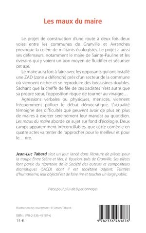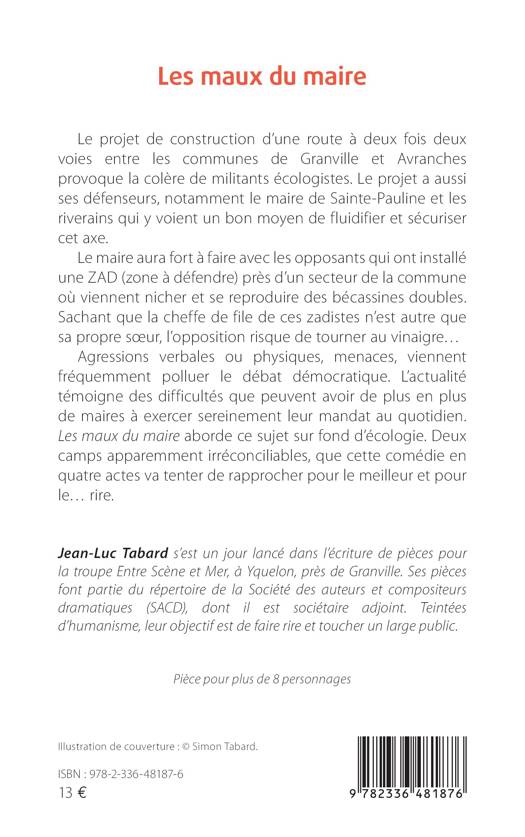 Le projet de construction d'une route à deux fois deux voies entre les communes de Granville et Avranches provoque la colère de militants écologistes. Le projet a aussi ses défenseurs, notamment le maire de Sainte-Pauline et les riverains qui y voient un bon moyen de fluidifier et sécuriser cet axe. Le maire aura fort à faire avec les opposants qui ont installé une ZAD (zone à défendre) près d'un secteur de la commune où viennent nicher et se reproduire des bécassines doubles. Sachant que la cheffe de file de ces zadistes n'est autre que sa propre sur, l'opposition risque de tourner au vinaigre Agressions verbales ou physiques, menaces, viennent fréquemment polluer le débat démocratique. L'actualité témoigne des difficultés que peuvent avoir de plus en plus de maires à exercer sereinement leur mandat au quotidien. Les maux du maire aborde ce sujet sur fond d'écologie. Deux camps apparemment irréconciliables, que cette comédie en quatre actes va tenter de rapprocher pour le meilleur et pour le rire.