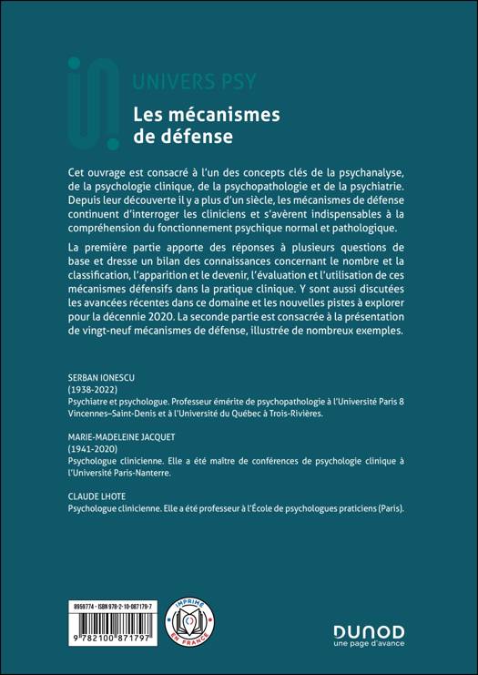 L’ouvrage est consacré à l’un des concepts clés de la psychanalyse, de la psychologie clinique, de la psychopathologie et de la psychiatrie. Un siècle après leur élaboration, les mécanismes de défense continuent d’interroger les cliniciens et s’avèrent indispensables à la compréhension du fonctionnement psychique normal et pathologique. La première partie apporte des réponses à plusieurs questions de base et dresse un bilan des recherches concernant l’apparition, le devenir, l’évaluation et l’utilisation de ces mécanismes défensifs, notamment du champ de la psychologie cognitive à celui de la psychothérapie. La deuxième partie est consacrée à la présentation de vingt-neuf mécanismes de défense, illustrée de nombreux exemples.