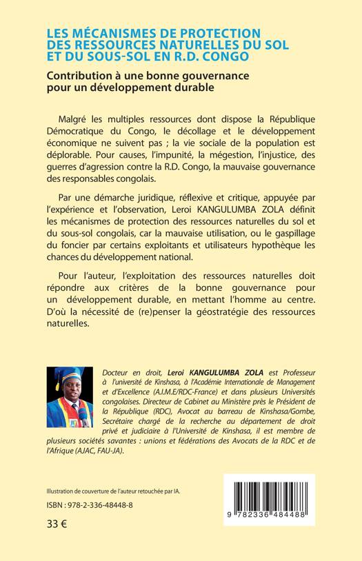 Malgré les multiples ressources dont dispose la République Démocratique du Congo, le décollage et le développement économique ne suivent pas; la vie sociale de la population est déplorable. Pour causes, l'impunité, la mégestion, l'injustice, des guerres d'agression contre la R.D. Congo, la mauvaise gouvernance des responsables congolais. Par une démarche juridique, réflexive et critique, appuyée par l'expérience et l'observation, Leroi KANGULUMBA ZOLA définit les mécanismes de protection des ressources naturelles du sol et du sous-sol congolais, car la mauvaise utilisation, ou le gaspillage du foncier par certains exploitants et utilisateurs hypothèque les chances du développement national. Pour l'auteur, l'exploitation des ressources naturelles doit répondre aux critères de la bonne gouvernance pour un développement durable, en mettant l'homme au centre. D'où, il faudrait (re)penser à la géostratégie des ressources naturelles.
