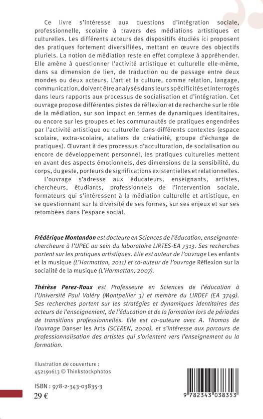 Ce livre s'intéresse aux questions d'intégration sociale, professionnelle, scolaire à travers des médiations artistiques et culturelles. Cet ouvrage propose différentes pistes de réflexion et de recherche sur le rôle de la médiation, sur son impact en termes de dynamiques identitaires, ou encore sur les groupes et les communautés de pratiques engendrées par l'activité artistique ou culturelles dans différents contextes (espace scolaire, extra-scolaire, ateliers de créativité, groupes d'échange de pratiques).