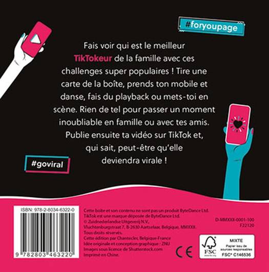 Fais voir qui est le meilleur TikTokeur de la famille avec ces challenges super populaires ! Tire une carte de la boîte, prends ton mobile et danse, fais du playback ou mets-toi en scène. Rien de tel pour passer un moment inoubliable en famille ou avec tes amis. Publie ensuite ta vidéo sur TikTok et, qui sait, peut-être qu'elle deviendra virale ! Boîte avec 50 cartes.