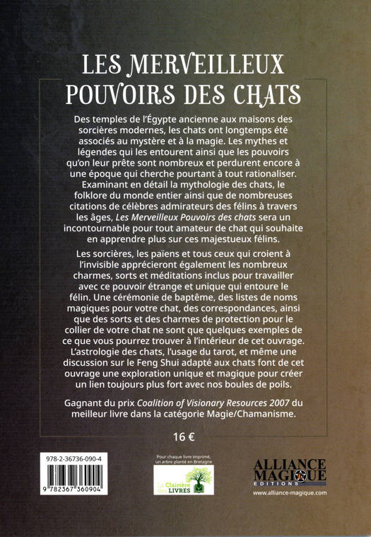 Des temples de l'Egypte ancienne aux maisons des sorcières modernes, les chats ont longtemps été associés au mystère et à la magie. Les mythes et légendes qui les entourent ainsi que les pouvoirs qu'on leur prête sont nombreux et perdurent encore à une époque qui cherche pourtant à tout rationaliser. Examinant en détail la mythologie des chats, le folklore du monde entier ainsi que de nombreuses citations de célèbres admirateurs des félins à travers les âges, Les merveilleux pouvoirs des Chats sera un incontournable pour tout amateur de chat qui souhaite en apprendre plus sur ces majestueux félins. Les sorcières, les païens et tous ceux qui croient à l'invisible apprécieront également les nombreux charmes, sorts et méditations inclus pour travailler avec ce pouvoir étrange et unique qui entoure le félin. Une cérémonie de baptême, des listes de noms magiques pour votre chat, des correspondances, ainsi que des sorts et des charmes de protection pour le collier de votre chat ne sont que quelques exemples de ce que vous pourrez trouver à l'intérieur de cet ouvrage.L'astrologie des chats, l'usage du tarot, et même une discussion sur le feng shui adapté aux chats font de cet ouvrage une exploration unique et magique pour créer un lien toujours plus fort avec nos boules de poils. Gagnant du prix "Coalition of Visionary Resources 2007" du meilleur livre dans la catégorie Magie/Chamanisme.