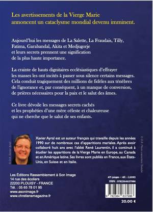 Les avertissements de la Vierge Marie annoncent un cataclysme mondial devenu imminent. Aujourd'hui, les messages de La Salette, La Fraudais, Tilly, Garabandal, Akita et Medjugorje et leurs secrets prennent une signification de la plus haute importance. La crainte de hauts dignitaires ecclésiastiques d'effrayer les masses les ont incités à passer sous silence certains messages. Cela conduit tragiquement des millions de fidèles aux ténèbres de l'ignorance et, par conséquent, à un manque de conversion, de prières nécessaires pour la paix et le salut des âmes. Ce livre dévoile les messages secrets cachés et les prophéties d'une mère céleste et chaleureuse qui ne cherche que le salut de ses enfants.