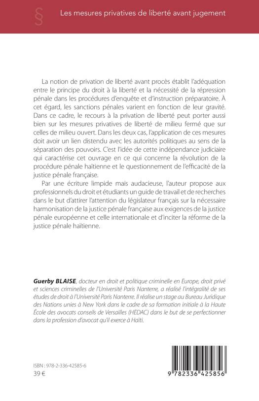 La notion de privation de liberté avant procès établit l'adéquation entre le principe du droit à la liberté et la nécessité de la répression pénale dans les procédures d'enquête et d'instruction préparatoire. À cet égard, les sanctions pénales varient en fonction de leur gravité. Dans ce cadre, le recours à la privation de liberté peut porter aussi bien sur les mesures privatives de liberté de milieu fermé que sur celles de milieu ouvert. Dans les deux cas, l'application de ces mesures doit avoir un lien distendu avec les autorités politiques au sens de la séparation des pouvoirs. C'est l'idée de cette indépendance judiciaire qui caractérise cet ouvrage en ce qui concerne la révolution de la procédure pénale haïtienne et le questionnement de l'efficacité de la justice pénale française. Par une écriture limpide mais audacieuse, l'auteur propose aux professionnels du droit et étudiants un guide de travail et de recherches dans le but d'attirer l'attention du législateur français sur la nécessaire harmonisation de la justice pénale française aux exigences de la justice pénale européenne et celle internationale et d'inciter la réforme de la justice pénale haïtienne.