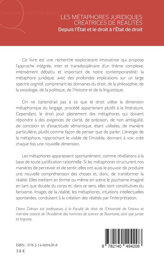 Ce livre est une recherche exploratoire innovatrice qui propose l’approche intégrée, inter et transdisciplinaire d’un thème complexe, intensément débattu et important de notre contemporanéité : la métaphore juridique, avec des profondes implications sur un large spectre cognitif, comprenant les domaines du droit, de la philosophie, de la sociologie, de la politique, de l’histoire et de la linguistique. On ne s’attendrait pas à ce que le droit utilise la dimension métaphorique du langage, procédé appartenant plutôt à la littérature. Cependant, le droit jouit pleinement des métaphores qui doivent répondre à des exigences de clarté, de précision, de non ambiguïté, de concision et d’exactitude sémantique, étant utilisées, de manière particulière, plutôt comme façon de penser que de parler. L’énergie de la métaphore, rapprochant le visible de l’invisible, donnant à voir, crée chaque fois une nouvelle dimension. Les métaphores apparaissent spontanément, comme révélations à la base de toute justification rationnelle. Si les métaphores structurent nos manières de percevoir et de sentir, elles ont aussi le pouvoir de produire une nouvelle compréhension des choses et, donc, de transformer la réalité. Elles mettent en forme ou même en scène le psychisme imaginé en tant que double du corps et, dans ce sens, elles sont constitutives du fantasme. Images de la réalité, les métaphores, intuitions intellectuelles spontanées, conduisent à la création des réalités par l’interprétation.