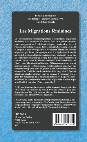 De l'invisibilité des femmes migrantes à la visibilité des migrations féminines, il y a un espace à explorer. Ce volume est inédit et original à plusieurs égards: il recueille la parole aux femmes migrantes par leurs témoignages mais il a également donné la parole à des responsables d'associations, celles du Grand-Est et de la Suisse romande. Il contient en outre, des articles de chercheurs et de chercheuses qui s'intéressent à la migration féminine.