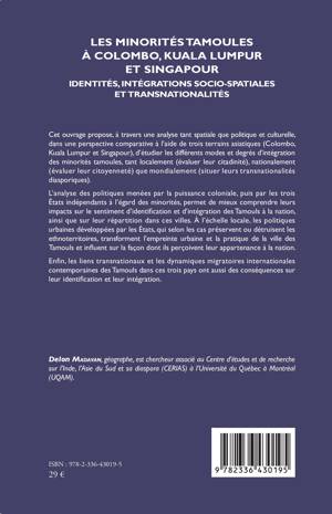 Cet ouvrage propose, à travers une analyse tant spatiale que politique et culturelle, dans une perspective comparative à l’aide de trois terrains asiatiques (Colombo, Kuala Lumpur et Singapour), d’étudier les différents modes et degrés d’intégration des minorités tamoules, tant localement (évaluer leur citadinité), nationalement (évaluer leur citoyenneté) que mondialement (situer leurs transnationalités diasporiques). L’analyse des politiques menées par la puissance coloniale, puis par les trois États indépendants à l’égard des minorités, permet de mieux comprendre leurs impacts sur le sentiment d’identification et d’intégration des Tamouls à la nation, ainsi que sur leur répartition dans ces villes. À l’échelle locale, les politiques urbaines développées par les États, qui selon les cas préservent ou détruisent les ethnoterritoires, transforment l’empreinte urbaine et la pratique de la ville des Tamouls et influent sur la façon dont ils perçoivent leur appartenance à la nation. Enfin, les liens transnationaux et les dynamiques migratoires internationales contemporaines des Tamouls dans ces trois pays ont aussi des conséquences sur leur identification et leur intégration.