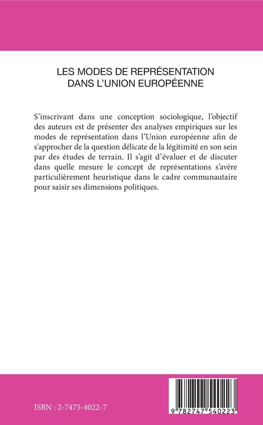 S'inscrivant dans une conception sociologique, l'objectif des auteurs est de présenter des analyses empiriques sur les modes de représentation dans l'Union européenne afin de s'approcher de la question délicate de la légitimité en son sein par des études de terrain. Il s'agit d'évaluer et de discuter dans quelle mesure le concept de représentations s'avère particulièrement heuristique dans le cadre communautaire pour saisir ses dimensions politiques.