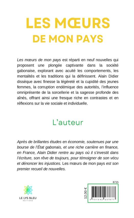 Les moeurs de mon pays est réparti en neuf nouvelles qui proposent une plongée captivante dans la société gabonaise, explorant avec acuité les comportements, les mentalités et les traditions qui la définissent. Alain Didier dissèque avec finesse la légèreté et la cupidité des jeunes femmes, la corruption endémique des autorités, l'influence omniprésente de la sorcellerie et la sagesse profonde des aînés, offrant ainsi une fresque riche en contrastes et en réflexions sur la vie sociale et individuelle.