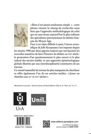 « Rien n’est jamais totalement simple » : cette phrase résume le champ de recherche aussi bien que l’approche méthodologique de celui qui est sans doute aujourd’hui le plus influent des spécialistes internationaux du théâtre français du Moyen Âge. Face à cet objet difficile à saisir, l’œuvre scientifique de Jelle Koopmans s’est imposée depuis les années 1980 par deux apports majeurs qui ont façonné les nouvelles manières de faire l’histoire du théâtre au XXIe siècle : la promotion d’un questionnement le plus ouvert et le plus radical des savoirs établis, et une approche épistémologique globale illustrée par une interdisciplinarité constitutive de ses travaux. Ce recueil d’articles rassemble les travaux les plus marquants du chercheur.
