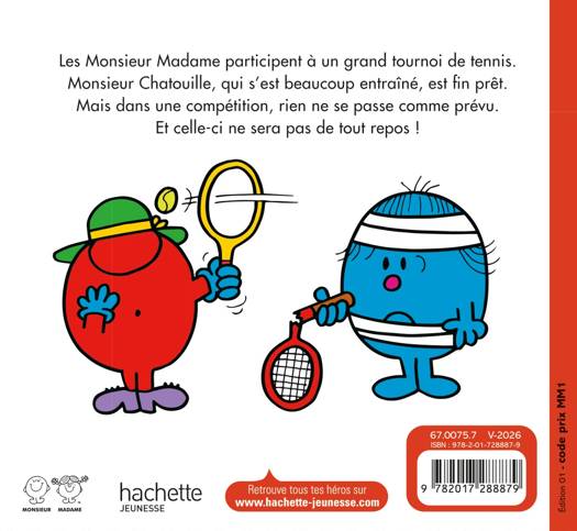Résumé :Les Monsieur Madame participent à un grand tournoi de tennis. Moncieur Chatouille, qui s'est beaucoup entraîné, est fin prêt. Mais dans une compétition, rien ne se passe comme prévu. Et celle-ci ne sera pas de tout repos !