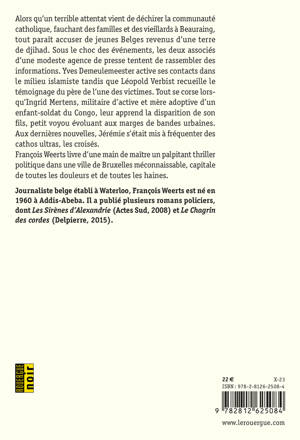 Alors qu'un terrible attentat vient de déchirer la communauté catholique, fauchant des familles et des vieillards à Beauraing, tout paraît accuser de jeunes Belges revenus d'une terre de djihad. Sous le choc des événements, les deux associés d'une modeste agence de presse tentent de rassembler des informations. Yves Demeulemeester active ses contacts dans le milieu islamiste tandis que Léopold Verbist recueille le témoignage du père de l'une des victimes. Tout se corse lorsqu'Ingrid Mertens, militaire d'active et mère adoptive d'un enfant-soldat du Congo, leur apprend la disparition de son fils, petit voyou évoluant aux marges de bandes urbaines. Aux dernières nouvelles, Jérémie s'était mis à fréquenter des cathos ultras, les croisés. Dans un Bruxelles que ne vont pas tarder à bouleverser de violentes émeutes et le déclenchement de lois martiales, Léo et ses acolytes ne cessent de buter sur les mêmes énigmatiques personnages. Que cachent le chanoine Dillens, chef spirituel des croisés, et l'officier Athlan, qui prend peu à peu la main sur le service d'ordre de la ville ? À quelles manoeuvres se livrent dans l'ombre leurs nervis ? Jusqu'à quel point porte leur influence dans la hiérarchie policière ? Dans la lourde atmosphère d'une capitale où monte la peur, François Weerts livre d'une main de maître un passionnant roman, portrait d'une ville autant qu'intrigue politique, dont aucun de ses personnages ne s'extirpera indemne.