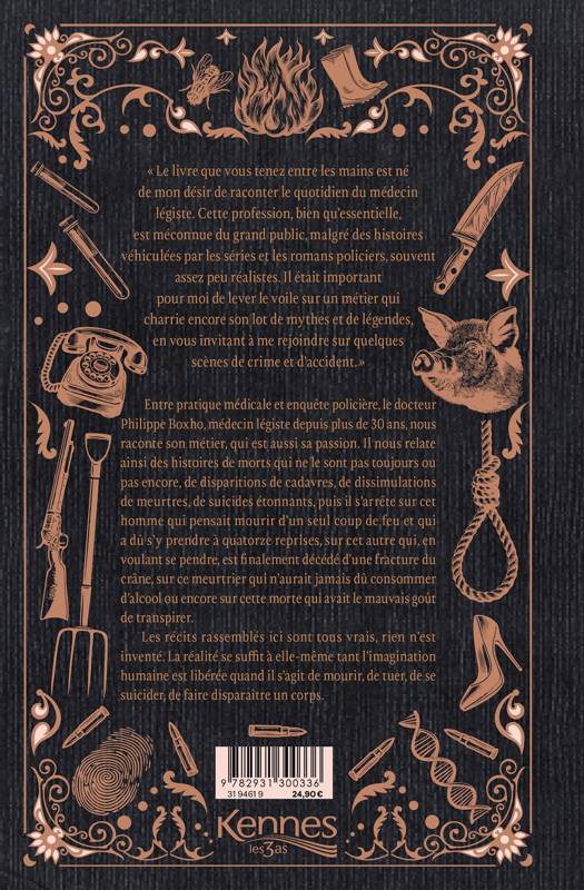 Médecin légiste, Philippe Boxho nous fait découvrir son quotidien fait de morts qui ne le sont pas toujours ou pas encore, de disparition de cadavres, de dissimulation de meurtres, de suicides étonnants. Les histoires qu'il raconte sont issues de la réalité, rien n'est inventé, il n'y a d'ailleurs pas besoin d'inventer, la réalité se suffit à elle seule tant l'imagination humaine est libérée quand il s'agit de mourir, de tuer, de se suicider, de faire disparaître un corps. Après un décryptage des séries américaines CSI, « les experts », en plus de 30 histoires, il raconte son métier, sa passion. Il nous raconte l'évolution des corps après la mort à travers des histoires de momies et de mouches, puis il s'arrête sur cet homme qui pensait mourir d'un seul coup de feu et qui restait encore vivant après le trentième, sur cet autre qui, en voulant se pendre, est décédé d'une fracture du crâne, ce meurtrier qui n'aurait jamais dû consommer d'alcool, cette morte qui transpirait. Vous ne verrez plus jamais un cochon ni un insert de cheminée de la même manière. Ce livre nous invite à rire de la mort avant qu'elle ne nous sourie.