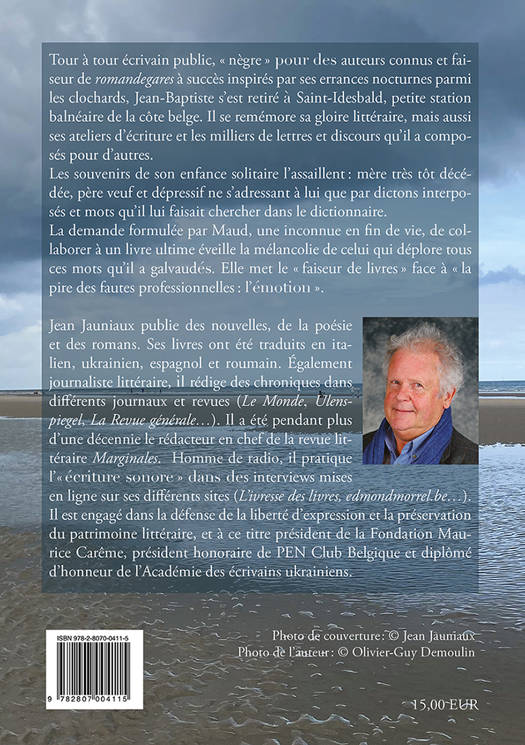 Tour à tour écrivain public, «ânègreâ» pour des auteurs connus et faiseur de romandegares à succès inspirés par ses errances nocturnes parmi les clochards, Jean-Baptiste s’est retiré à Saint-Idesbald, petite station balnéaire de la côte belge. Il se remémore sa gloire littéraire, mais aussi ses ateliers d’écriture et les milliers de lettres et discours qu’il a composés pour d’autres. Les souvenirs de son enfance solitaire l’assaillentâ: mère très tôt décédée, père veuf et dépressif ne s’adressant à lui que par dictons interposés et mots qu’il lui faisait chercher dans le dictionnaire.<br /> La demande formulée par Maud, une inconnue en fin de vie, de collaborer à un livre ultime éveille la mélancolie de celui qui déplore tous ces mots qu’il a galvaudés. Elle met le «âfaiseur de livresâ» face à «âla pire des fautes professionnellesâ: l’émotionâ».<br /> Jean Jauniaux publie des nouvelles, de la poésie et des romans. Ses livres ont été traduits en italien, ukrainien, espagnol et roumain. Également journaliste littéraire, il rédige des chroniques dans différents journaux et revues (Le Monde, Ulenspiegel, La Revue générale...). Il a été pendant plus d’une décennie le rédacteur en chef de la revue littéraire Marginales. Homme de radio, il pratique l’«âécriture sonoreâ» dans des interviews mises en ligne sur ses différents sites (L’ivresse des livres, edmondmorrel.be...). Il est engagé dans la défense de la liberté d’expression et la préservation du patrimoine littéraire, et à ce titre président de la Fondation Maurice Carême, président honoraire de PEN Club Belgique et diplômé d’honneur de l’Académie des écrivains ukrainiens.<br />