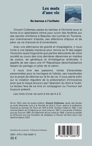 Vincent Cottereau passe du barreau à l'écritoire sous la forme d'un abécédaire intime pour ouvrir des fenêtres sur ses secrets d'enfance à Beaulieu-les-Loches en Touraine, son cheminement d'adulte, ses affections d'époux et de père, sa vie d'avocat et d'universitaire. Avec une alternance de gravité et d'espièglerie, il nous invite à une balade imprévue pour revivre au fil des pages l'évolution aussi fulgurante que parfois déroutante de notre société au cours des cinq dernières décennies en matière de justice, de génétique et d'intelligence artificielle. Il appelle de ses voeux une VIe République décentralisatrice faisant du partage un pilier de la nation. Il nous livre ses passions, riches d'anecdotes personnelles pour la montagne et l'aïkido, ses inquiétudes sur le projet de réforme sur la fin de vie. Il nous alerte enfin sur la violation régulière de la présomption d'innocence ainsi que le risque encouru par l'abandon du droit à l'oubli. Le lecteur fera de ce livre un compagnon ou l'humour est toujours présent. Les mots d'une vie sont à lire de A à Z.