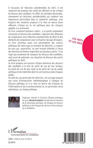 À l'occasion de l'élection présidentielle de 2017, cet ouvrage présente des outils de réflexion et de critique du discours des candidats. Il comprend ainsi plusieurs volets : à la partie proprement consacrée au discours des candidats, s'ajoutent des éléments de comparaison avec l'élection présidentielle de 2012 ainsi qu'avec la situation de pays étrangers. Ce livre constitue aussi une présentation des acteurs politiques de la France au moment de l'élection, en proposant une lecture critique et attentive de leurs discours.