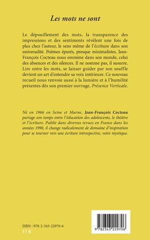 Le dépouillement des mots, la transparence des impressions et des sentiments révèlent une fois de plus chez l'auteur, le sens même de l'écriture dans son universalité. Poèmes épurés, presque minimalistes, Jean-François Cocteau nous emmène dans son monde, celui des absences et des silences. Il ne nomme pas, il susurre. Lire entre les mots, se laisser guider par son souffle devient un art d'entendre sa voix intérieure. Ce nouveau recueil nous renvoie aussi à la lumière et à l'humilité présentes dès son premier ouvrage, Présence Verticale.