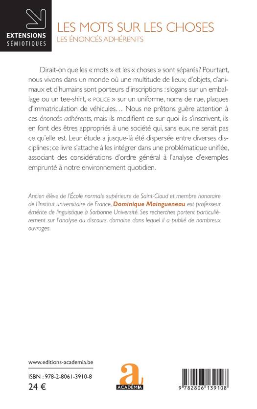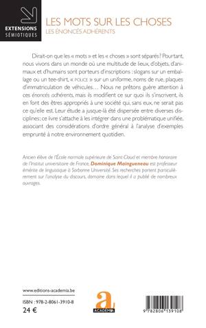 Dirait-on que les mots et les choses sont séparés ? Pourtant, nous vivons dans un monde où une multitude de lieux, d'objets, d'animaux et d'humains sont porteurs d'inscriptions: slogans sur un emballage ou un tee-shirt, POLICE sur un uniforme, noms de rue, plaques d'immatriculation de véhicules... Nous ne prêtons guère attention à ces énoncés adhérents, mais ils modifient ce sur quoi ils s'inscrivent, ils en font des êtres appropriés à une société qui, sans eux, ne serait pas ce qu'elle est. Leur étude a jusque-là été dispersée entre diverses disciplines; ce livre s'attache à les intégrer dans une problématique unifiée, associant des considérations d'ordre général à l'analyse d'exemples emprunté à notre environnement quotidien.