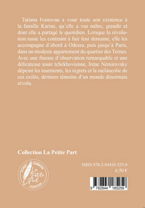 Tatiana Ivanovna a voué toute son existence à la famille Karine, qu’elle a vus naître, grandir et dont elle a partagé le quotidien. Lorsque la révolution russe les contraint à fuir leur domaine, elle les accompagne d’abord à Odessa, puis jusqu’à Paris, dans un modeste appartement du quartier des Ternes. Avec une finesse d’observation remarquable et une délicatesse toute tchékhovienne, Irène Némirovsky dépeint les tourments, les regrets et la mélancolie de ces exilés, derniers témoins d’un monde désormais révolu.