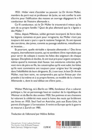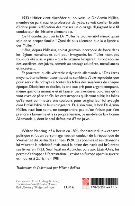 1933: Hitler vient d'acceder au pouvoir. Le Dr Armin Muller, membre du parti nazi et professeur de lycee, se voit confier le soin d'ecrire pour l'edification des masses un ouvrage degageant le fil conducteur de l'histoire allemande. Ce fil conducteur, ou le Dr Muller le trouverait-il mieux qu'au sein de sa propre famille ? Quoi de plus allemand que la lignee des Muller ? Helas, depuis Millesius, soldat germain incorpore de force dans les legions romaines et puni pour ivrognerie, les Muller n'ont pas toujours ete aussi purs que le nazisme l'exigerait. Ils ont epouse des sorcieres, des juives, commis au passage adulteres, mesalliances et incestes... Et pourtant, quelle veritable dynastie allemande ! Des etres moyens, eternellement soumis, qui ne semblent s'etre reproduits que pour servir de cobayes a toutes les folies des seigneurs de chaque epoque. Disciplines et dociles, ils ont tout pris pour argent comptant, meme quand la monnaie etait fausse. Les aventures colorees qu'ils vont vivre de pere en fils, les catastrophes qu'ils vont subir, les folies qu'ils vont commettre ont toujours pour origine leur foi aveugle dans l'infaillibilite de leurs dirigeants. Et, a son tour, le bon Dr Armin Muller, nazi bon teint, ne comprendra pas qu'on finisse par s'en prendre a lui-meme et a sa propre femme, ce modele de la bonne Allemande , dont le seul defaut est d'etre juive...