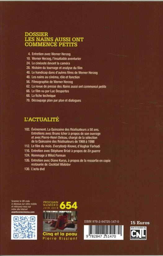 La Quinzaine des réalisateurs, sélection parallèle du Festival de Cannes, fête cette année sa cinquantième édition. Nombre de réalisateurs et de films marquants y ont été sélectionnés, à commencer par Les Nains aussi ont commencé petits (1970). Ce n'est que le deuxième film de l'Allemand Werner Herzog, cinéaste aventurier et visionnaire, aussi à l'aise dans le documentaire que la fiction, mais celui-ci y fait déjà preuve du sens de la transgression qui fera sa renommée. Interprété uniquement par des acteurs de « petite taille », le film peut être vu comme une allégorie mystérieuse et cruelle de la condition humaine. Dès sa sortie, le film donne lieu à des réactions contrastées où l'admiration le dispute au malaise. L'Avant-Scène Cinéma publie comme à son habitude le découpage plan par plan du film et présente un important dossier sur la carrière d'Herzog, et un "panorama des nains au cinéma" qui s'imposait.