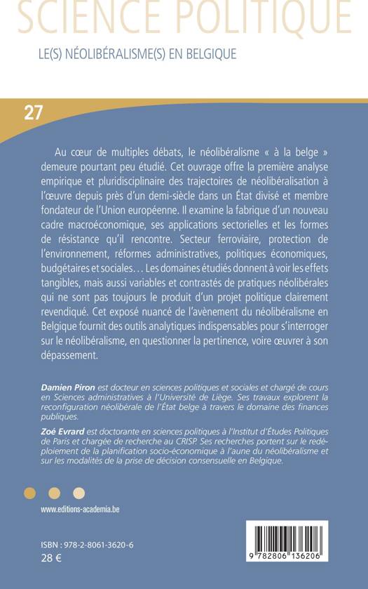 Si le néolibéralisme et ses avatars sont au cœur de multiples débats scientifiques et sociétaux, ils demeurent paradoxalement peu étudiés dans le cas belge. Cet ouvrage entend combler ce vide en offrant une analyse empirique et pluridisciplinaire (science politique, sociologie, droit, économie et philosophie) inédite des trajectoires de néolibéralisation à l’œuvre depuis près d’un demi-siècle dans un État divisé et membre fondateur de l’Union européenne. Cet exposé clair et nuancé de l’avènement, de la diffusion et des conséquences du néolibéralisme en Belgique fournit aussi des outils analytiques indispensables à tous celles et ceux qui s’interrogent sur le néolibéralisme, en questionnent la pertinence, voire œuvrent à son dépassement.