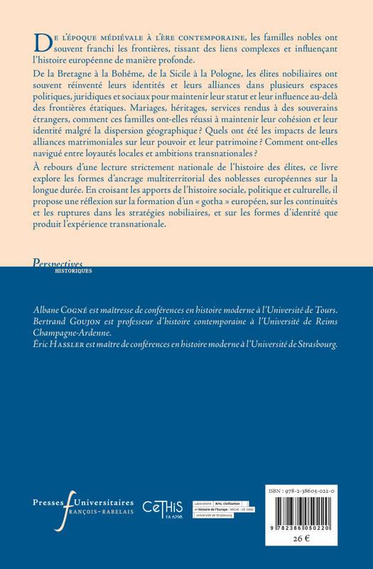 À rebours d’une lecture strictement nationale de l’histoire des élites, ce livre explore, grâce à des études variées, les formes d’ancrage pluriterritorial des noblesses européennes sur la longue durée. En croisant les apports de l’histoire sociale, politique et culturelle, il propose une réflexion sur la formation d’un « gotha » européen, sur les continuités et les ruptures dans les stratégies nobiliaires, et sur les formes d’identité que produit l’expérience transnationale.